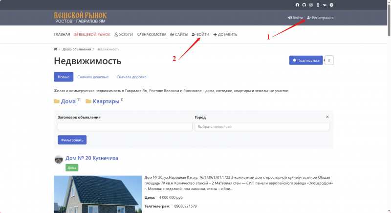 Зарегистрируйтесь на нашем портале "Куплю-продам" и Войдите на сайт под своим логином (почта) и паролем . У нас быстрая регистрация менее 30 сек. Это можно сделать в шапке сайта справа на любой странице (см. 1 на рис) или нажав кнопку "Войти" в меню сайта (см. 2 на рис). После регистрации вы сможете бесплатно добавлять объявления в каталог, новости, подписываться и оставлять комментарии.